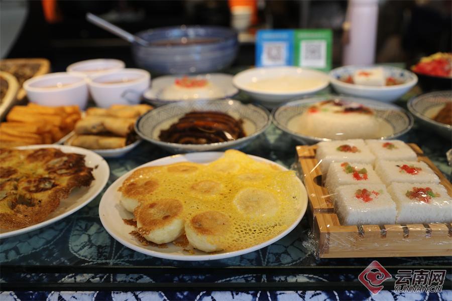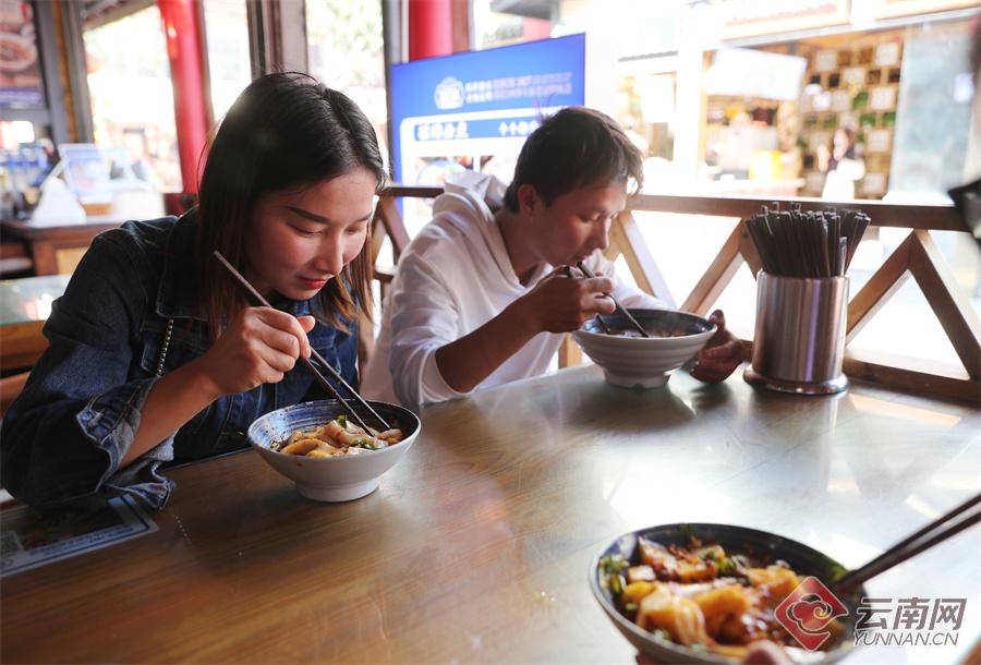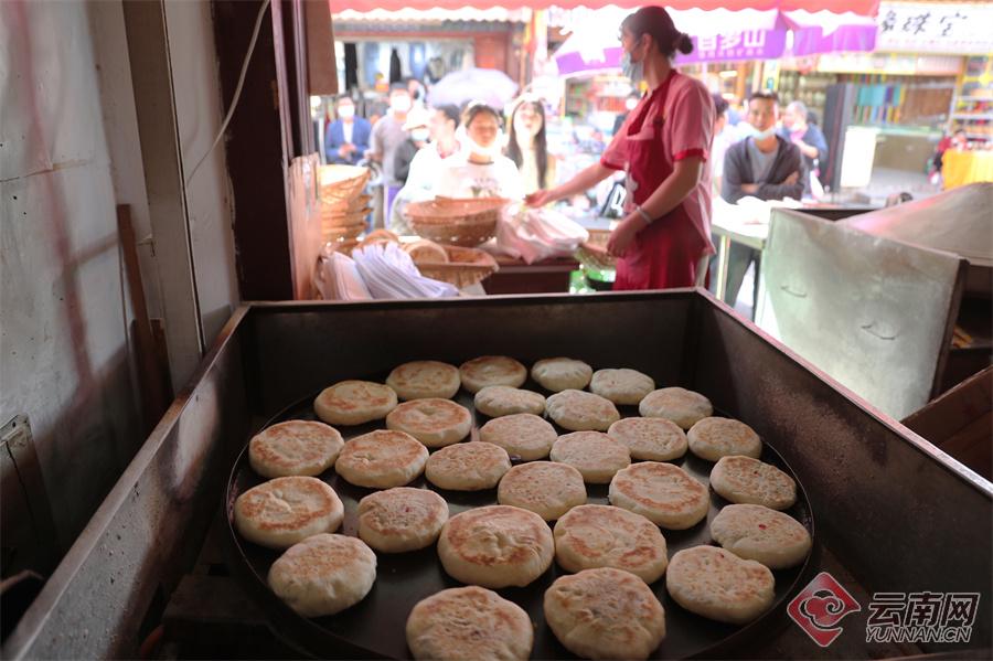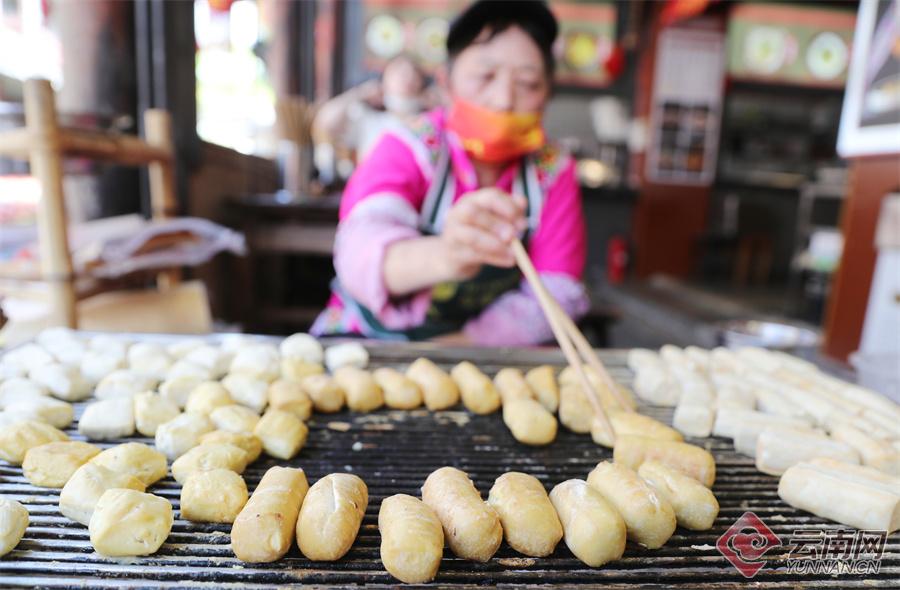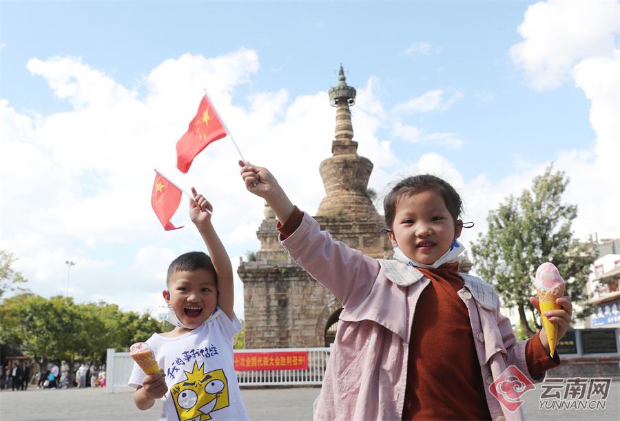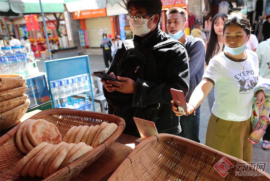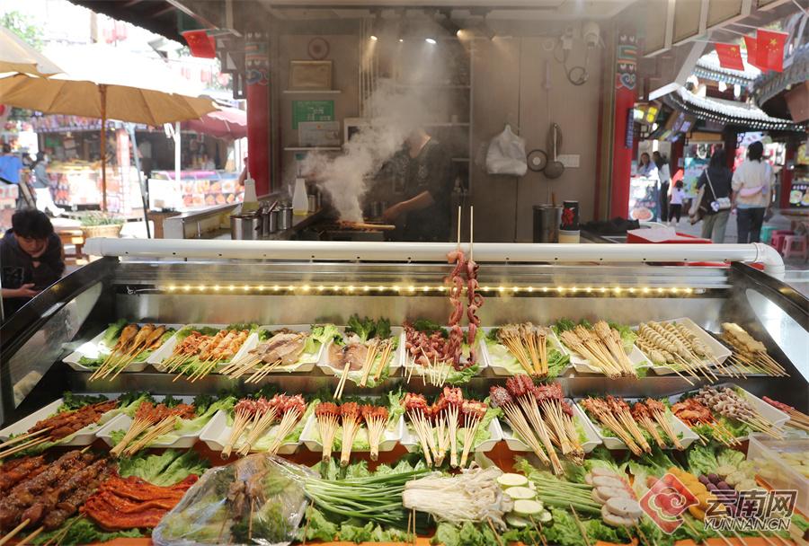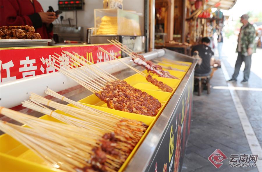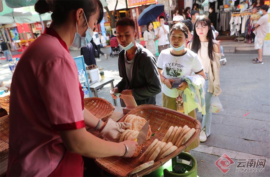 烤肉串、炸土豆、臭豆腐、官渡粑粑……国庆期间的官渡古镇,鲜艳的红旗与古建筑相得益彰,市民们逛古街、品小吃,感受地道老昆明烟火气息。