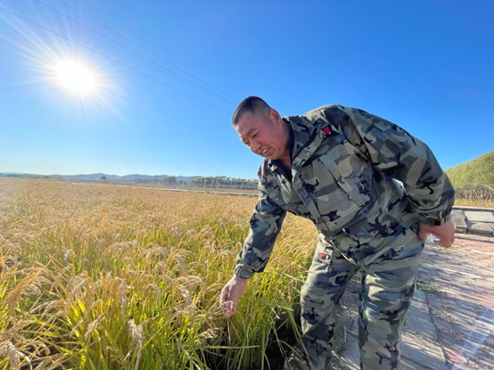 九月末,松花江农场,已随处可见翻滚的稻田金浪。农场地处哈尔滨市依兰县境内、松花江北岸,这里正孕育着中国最优质的稻米。每年收稻前的这段日子,正是松花江农场二作业区职工邢玉文心里最舒坦的时候。
