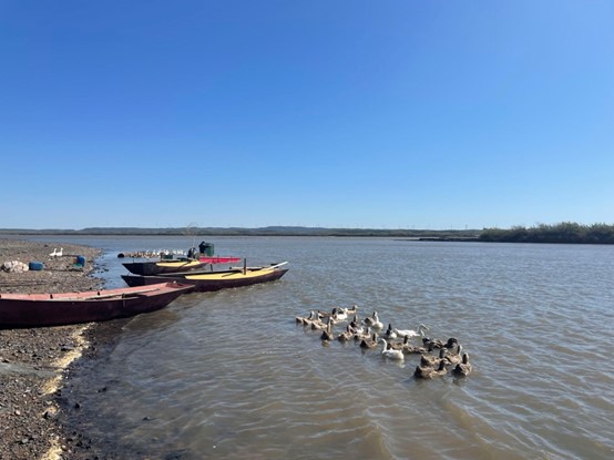 农户在松花江畔散养的鸭子靠捕食江里的野生鱼虾生长(总台央广记者韩雪莹 摄)