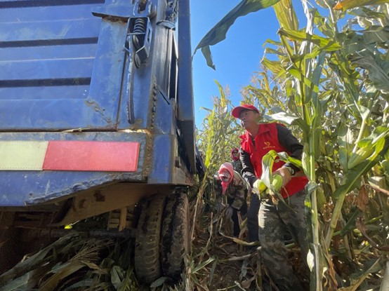 巩汝喜和农户在地里收玉米(总台央广记者韩雪莹 摄)
