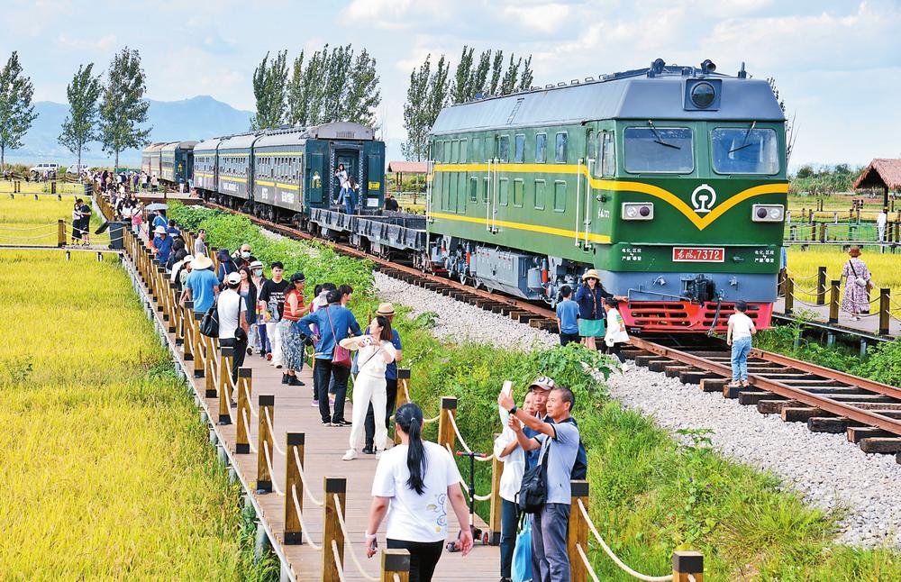 国庆假期,晋宁区晋城镇沙堤村生态水稻正值打谷期,慕名前来的游人沿着稻田边的景观栈道,一路感受田园风光、体验农耕文化,与穿越稻田的绿皮小火车拍照留影。 云南日报记者 杨峥 通讯员 杨崇云 摄