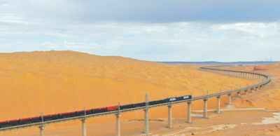甘肃省酒泉市阿克塞哈萨克族自治县,一列货运列车载着货物行驶在敦格铁路上。敦格铁路自2019年12月建成通车以来,对西北地区进一步开发做出积极贡献。