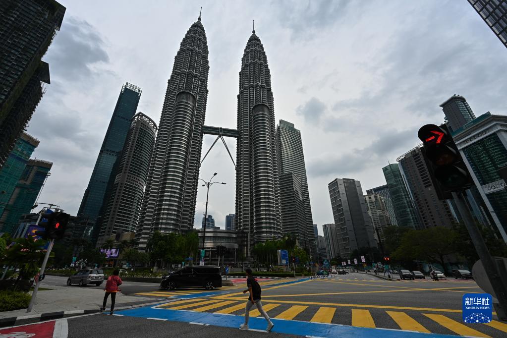 10月10日,在马来西亚吉隆坡,人们从马来西亚国家石油公司双塔前走过。新华社 记者/朱炜 摄