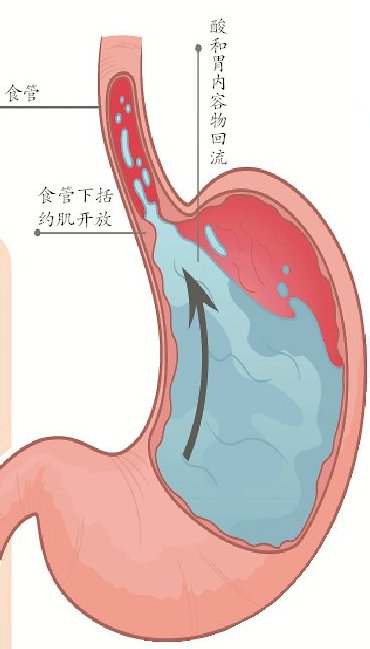 二是反酸(反流),指胃内容物毫不费力地向上至口腔,通常伴有烧心、尝到酸味或苦味。若患者感知到的是酸性物质,则为反酸;感知到的是食物,则为反食;还有少数患者感知到的是胆汁或黏液。反酸也是胃食管反流病的常见症状,累及60%至80%的患者。