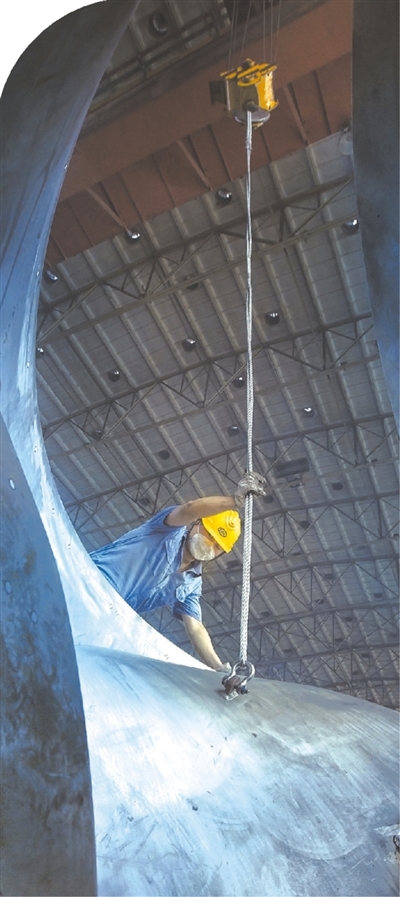 工人正在对白鹤滩水电站百万千瓦水电机组转轮叶片进行装配作业。白鹤滩机组精品标准要求的磁轭中心偏差为0.15毫米,叠装形成的磁轭中心相对理论中心偏差不超过0.02毫米,远优于精品标准要求。东方电气集团供图