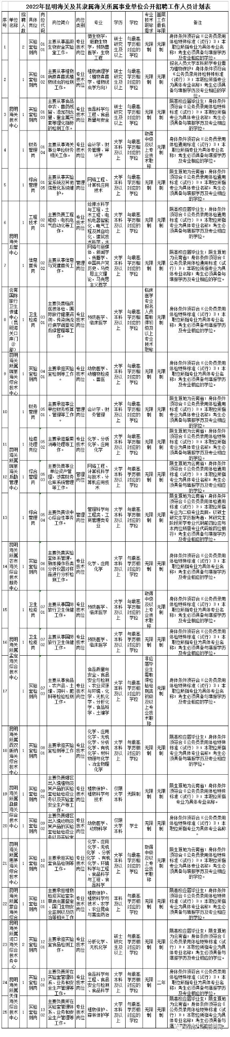 昆明海关及其隶属海关所属事业单位面向社会公开招聘27名事业编制工作人员,具体招聘岗位信息见下图。