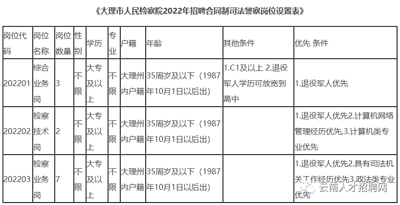 大理市人民检察院面向社会公开招聘合同制司法警察12名,岗位设置详见《2022年招聘大理市检察院合同制司法警察岗位设置表》(下图)。