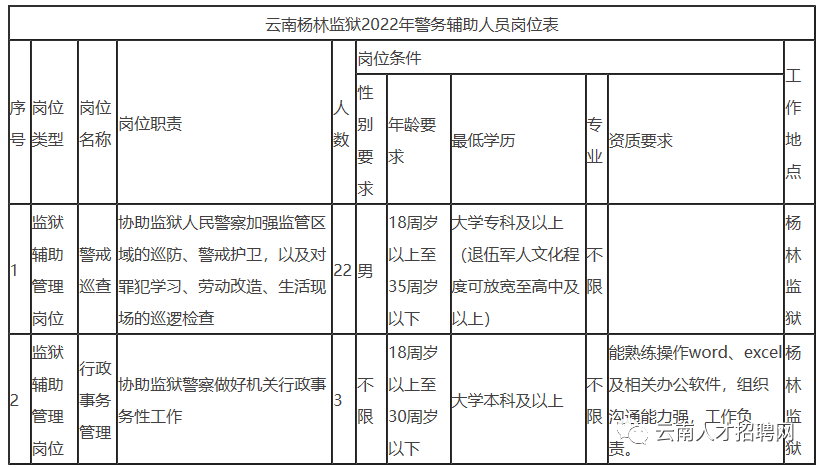 云南省杨林监狱现面向社会公开招聘25名警务辅助劳务派遣人员,具体招聘岗位信息见下图。
