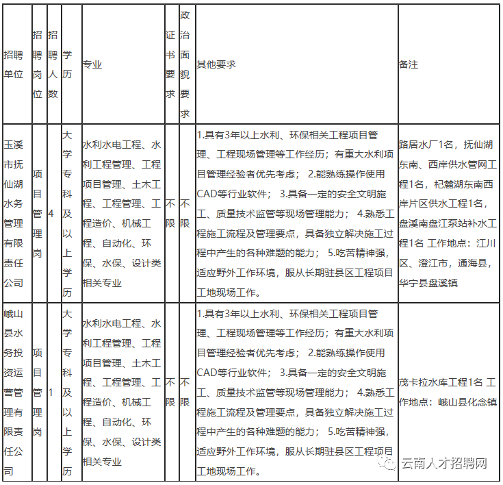 玉溪市抚仙湖水务管理有限责任公司计划招聘5名工作人员,具体招聘岗位信息见下图。