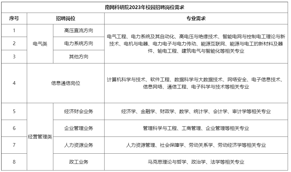 南方电网科学研究院有限责任公司招聘面向国内外各大院校2023届硕士及以上学历应届毕业生,主要招聘电气类、信息通信类、经营管理类3个岗位,详细岗位信息见下图。