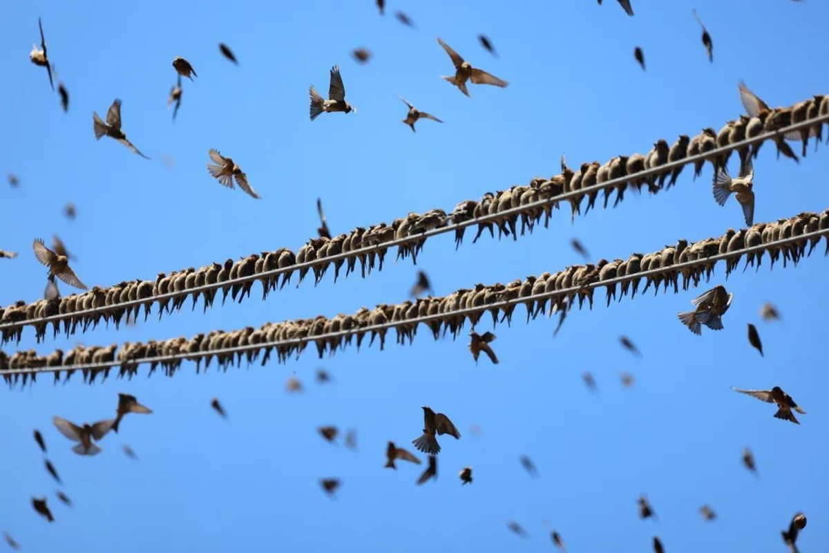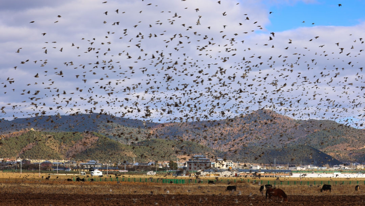 2021年底,数万只林岭雀聚集在纳帕海湿地,形成壮观的“鸟浪”。图源:央视新闻