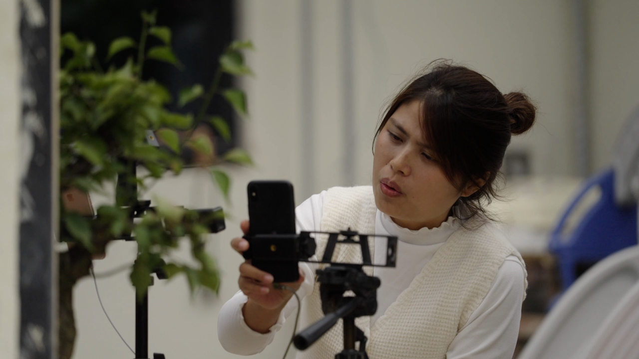 “感谢大家关注。下面给大家介绍一款新品。”在村民黄虎家中,妻子周艳荣正在直播销售绿植,院子里高高低低摆了十几盆盆栽。黄虎夫妻原本在县城里开了个小店,生意时好时坏,在朋友的带动下,夫妻俩开始接触电商,随着业务量的扩大,他们索性搬回村子,在家旁边包了一个60多平方米的大棚,专门储存、养护批发来的盆栽。手机成为新农具,直播成为新农活。妻子直播间里接订单,黄虎负责快递和售后,夫妻俩配合默契,去年销售额达到40多万元,小日子过得很满足。
