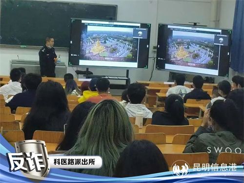 科医路派出所新域警务区社区民警杨占宏主动对接昆明城市学院保卫、学工部门,采用“线上直播、线下课堂”联动的讲课方式,对学院师生开展了反电诈安全讲座。民警对同学们语重心长地说,“这些骗术虽然看起来让人眼花缭乱,五花八门,但其实都是紧扣人的欲望来下套,只要牢记‘个人信息不泄露、陌生网址不点击、不听不信不转账,不贪不怕不上当’的四大反诈诀窍,就不会轻易被骗。”