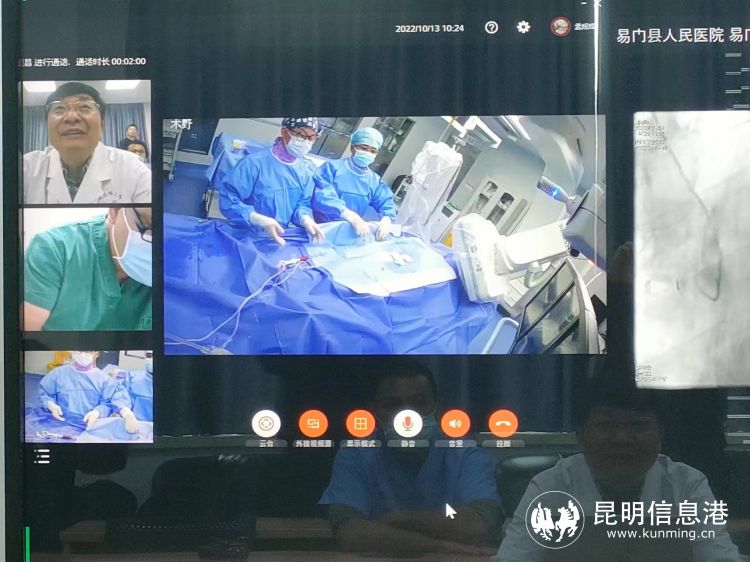 10月13日上午9时30分,昆医大附一院心脏内科远程治疗中心专家团队技术指导相隔119公里的玉溪市易门县人民医院进行冠状动脉造影术检查。手术共进行半个小时,整个手术过程操作规范、顺畅。易门县人民医院心内科普主任及昆医大附一院专家组通过5G远程共同协作下,手术圆满成功,血压正常,生命体征稳定,生理指标正常,已回病房进行监护。
