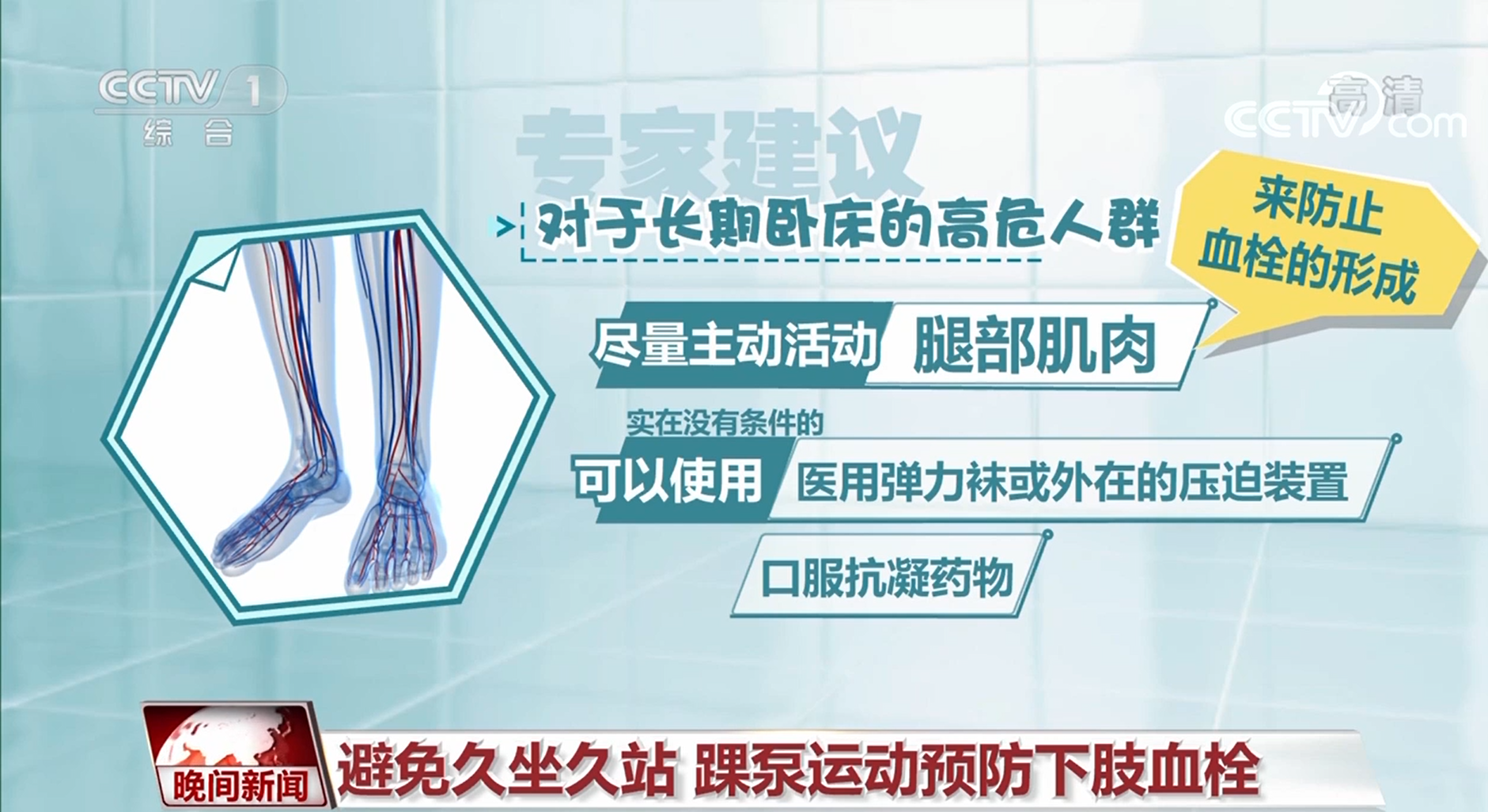 日常生活中,该如何预防下肢静脉血栓呢?对于长期卧床的高危人群,专家建议尽量主动活动腿部肌肉,实在没有条件的,可以使用医用弹力袜或外在的压迫装置,甚至口服抗凝药物,来防止血栓的形成。对于普通人群,要尽量避免久坐久站,增加下肢活动量。