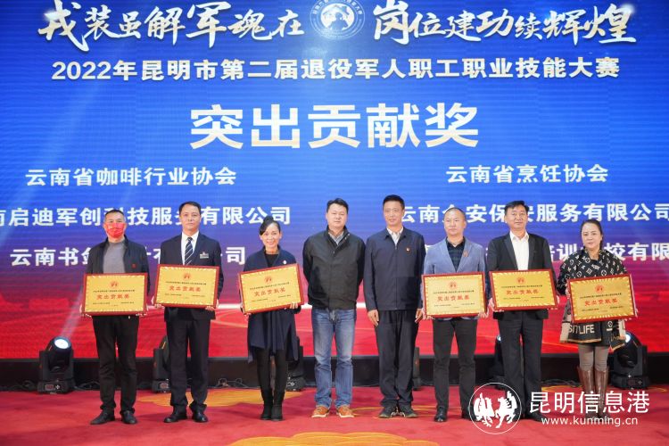 西山区退役军人事务局、五华区退役军人事务局、云南省咖啡行业协会、云南省烹饪协会、云南众安保安服务有限公司、云南启迪军创科技服务有限公司、云南书剑茶叶有限公司、云南飞虎职业技能培训学校有限公司荣获“突出贡献奖”。