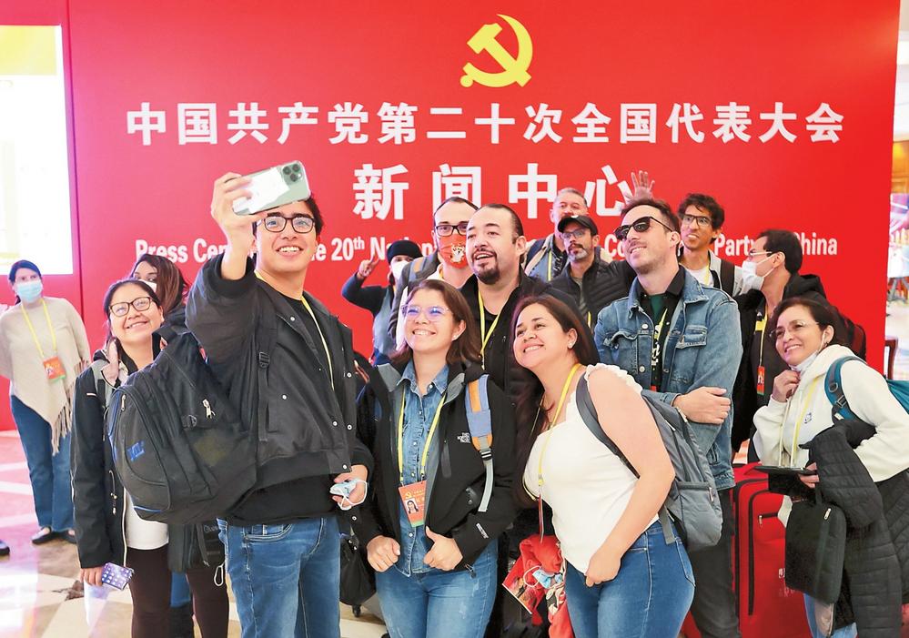 境内外记者在党的二十大新闻中心合影。本报特派记者 周灿 雷桐苏 摄