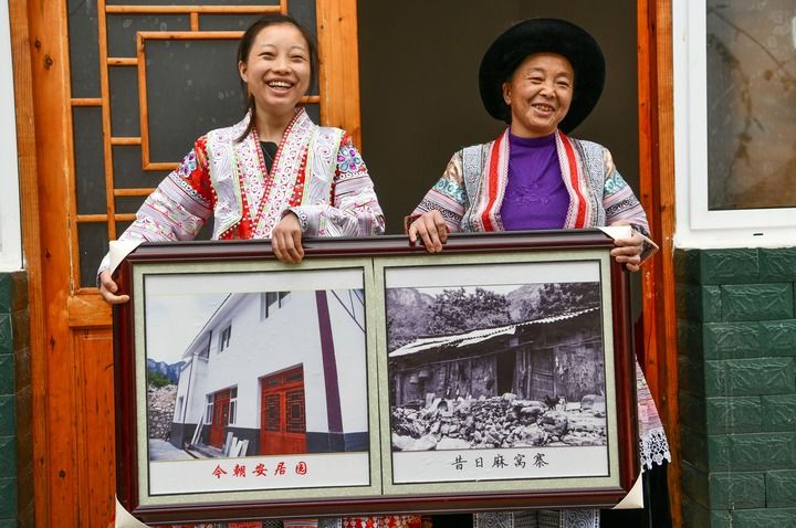在贵州新仁苗族乡化屋村麻窝寨易地扶贫搬迁集中安置点,苗族女孩王代玉(左)与母亲杨文梅在自家新房前展示易地扶贫搬迁前后的对比照片(2021年2月20日摄)。新华社记者 杨文斌 摄