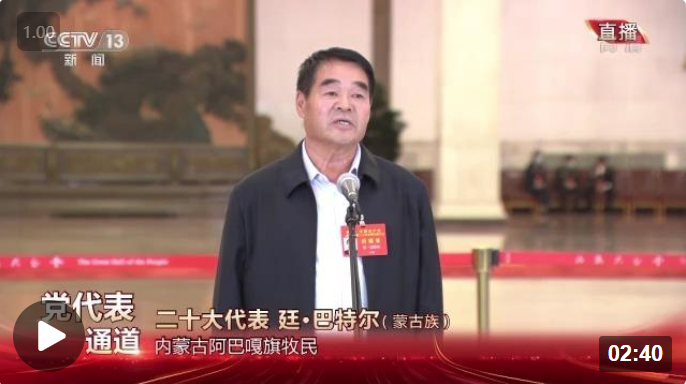 二十大代表 内蒙古阿巴嘎旗牧民 廷·巴特尔:我在嘎查担任了四十多年的嘎查书记和嘎查长。好多人问我,一个将军的孩子怎么会在牧区一待就是48年?我19岁来到了牧区,到了嘎查以后,看到嘎查的牧民生活得很艰难,条件很差。当时没有公路,也没有电,也没有通信。我有一次出差回来,带了一台收音机,在休息的空余时间,全嘎查的牧民都去我那里听收音机、听故事。当时我就想,我应该扎根在草原,同草原的牧民群众一道建设我们美丽的草原,保护草原生态,让牧民们过上更好的生活。