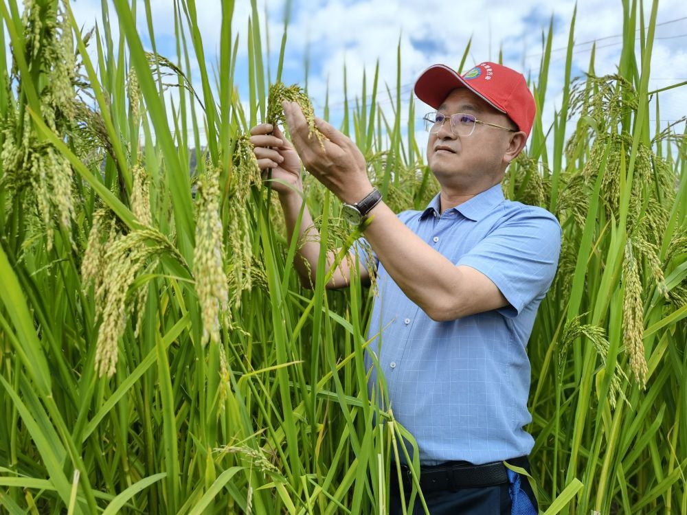 云南大学教授胡凤益在田间观察多年生稻长势。(受访者供图)
