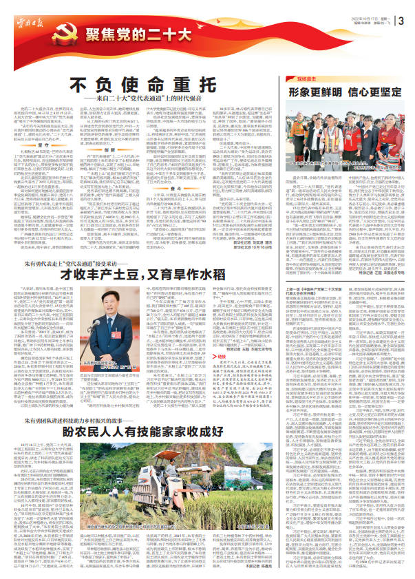 “第一批听我太空授课的孩子,如今已经成为我航天战线的队友。”“原来我们在训练场上只能听到东北话,但现在来自五湖四海的口音都会在训练场上回荡。”“我们从贫困村发展成为‘农家乐、民宿忙、瓜果香、游客如织来下姜’的富丽乡村。”“现在在公益救援领域,有越来越多的青年志愿者加入进来。”……站在通道上,代表们自信地回答中外记者的争相提问,从容而坚定的眼神、自强而奋发的故事,让全世界瞬间看到了新时代一个个具体而丰满的中国共产党人,也看到了新时代中国人民更加自信、自立、自强的立体形象。