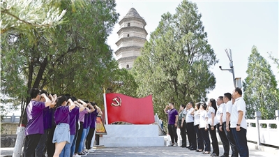 党员在陕西延安市宝塔山重温入党誓词。新华社记者 张博文摄