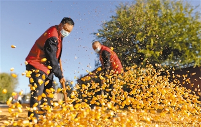 新疆塔城市阔克加依达克村的党员干部、驻村工作队队员组成志愿服务队,帮助村民翻晒玉米。文博摄(影像中国)