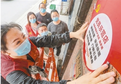 河北秦皇岛市海港区东环路街道东环北里社区工作人员为“党员示范店”商户挂牌。曹建雄摄(影像中国)