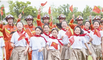江苏淮安市生态文旅区消防救援指战员与学生们联合开展主题党日活动。赵启瑞摄(人民视觉)