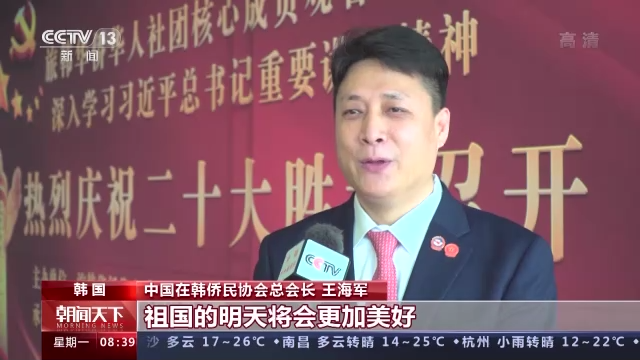 中国在韩侨民协会总会长 王海军:我们坚信,二十大后,中国的发展道路会更加宽广,祖国的明天会更加美好。作为生活在韩国的华侨华人,我们将紧紧跟随祖国的坚定步伐,为实现祖国统一和民族伟大复兴,作出无愧于时代的贡献。