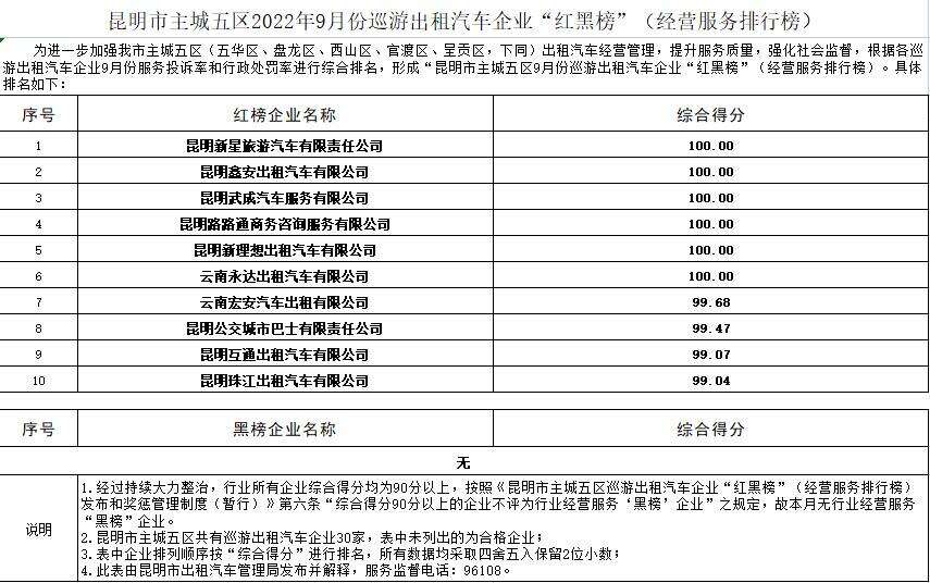 10月17日,昆明市出租汽车管理局公布了《昆明市主城五区2022年9月份巡游出租汽车企业“红黑榜”(经营服务排行榜)》。9月份,昆明市主城五区有10家巡游出租汽车企业被评为“红榜”企业,无“黑榜”企业。