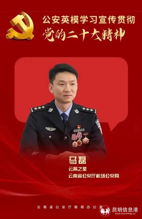 云警之星、云南省公安厅民用机场公安局民警马磊:作为一名新时代的青年民警,我将把党的二十大精神转换为工作动力,坚持和发展新时代“枫桥经验”,聚焦机场空防安全,立足新“五小工程”,紧盯矛盾纠纷排查化解、新冠肺炎疫情常态防控、打击跨境违法犯罪等任务目标,认真履职尽责,踏踏实实处理好每一起警情、解决好每一起纠纷、回应好每一起求助,为建设平安民航、守护平安空港贡献力量!(昆明信息港 记者合宇聪 云南省公安厅供图)