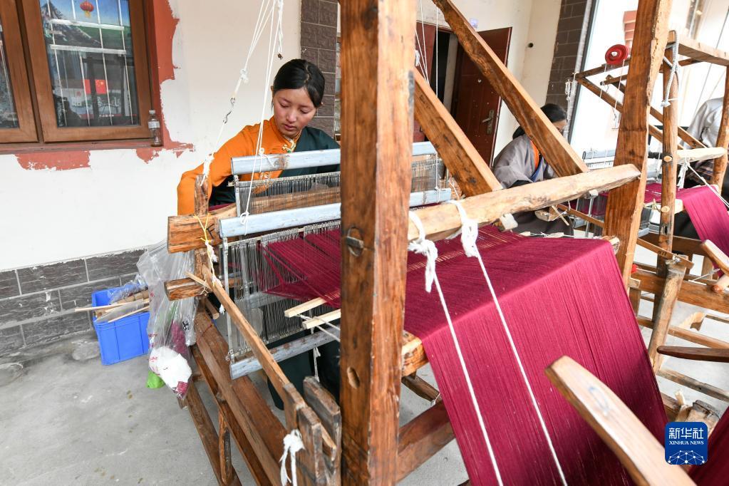 10月16日,在四川阿坝汶川县映秀镇渔子溪村,织工在纺织牦牛绒披肩。新华社记者 唐文豪 摄
