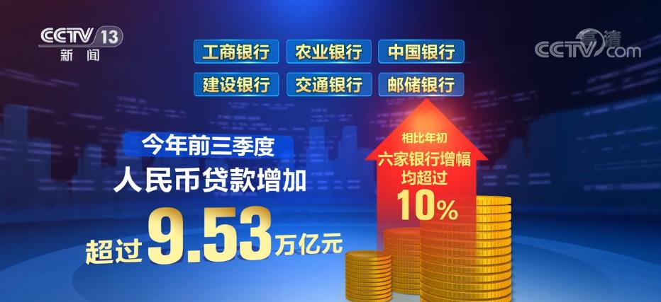 工商银行、农业银行、中国银行、建设银行、交通银行、邮储银行发布的最新公告显示,今年前三季度六大银行人民币贷款增加超过9.53万亿元,相比年初,六家银行增幅均超过10%。