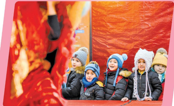 小朋友在新疆乌鲁木齐大巴扎步行街观看元宵节舞狮表演。 新华社记者 王菲 摄
