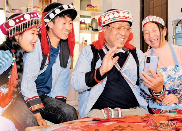 云南省泸水市和谐社区居民开干益以微信视频方式向在广东务工的女儿送去新年祝福。通讯员 高玉生 摄