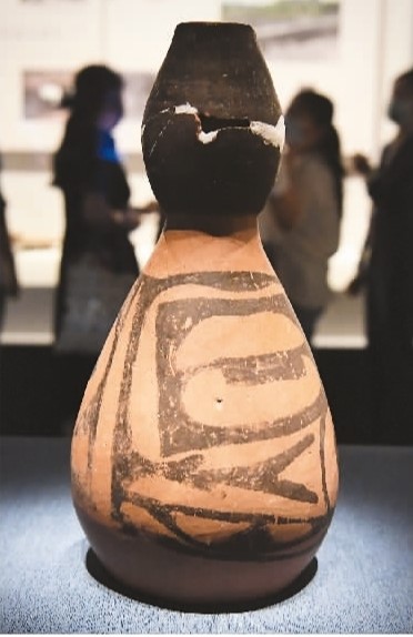 “繁星盈天——中国百年百大考古发现展”上展出的仰韶文化几何鱼纹彩陶葫芦瓶。新华社记者 李安 摄