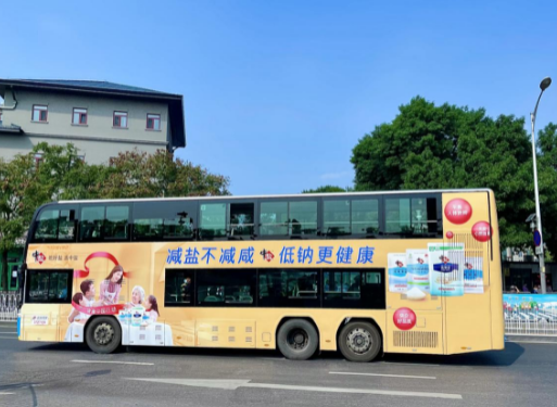 “中盐健康低钠巴士”的投放,是中盐集团宣传健康减盐的又一重要举措,旨在通过巴士这一行走的广告,为低钠盐作巡回宣传。本次“中盐巴士”车身设计以橙色为主导,活力亮眼,“减盐不减咸,低钠更健康”的slogan重点突出,一眼占据视觉中心,强化了低钠盐在健康减盐中的重要性。