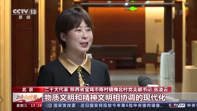 二十大代表 陕西省宝鸡市陈村镇槐北村党支部书记 张凌云:就在我来开会之前,我们村70多岁的老党员找到了我,说,闺女啊,咱们村能不能建一个文化大舞台,我想现在大家富裕了,生活水平提高了,就需要一些精神上的需求了。二十大报告明确指出,中国式现代化是物质文明和精神文明相协调的现代化。下一步,我们的目标更明确了,文化大舞台正在路上。