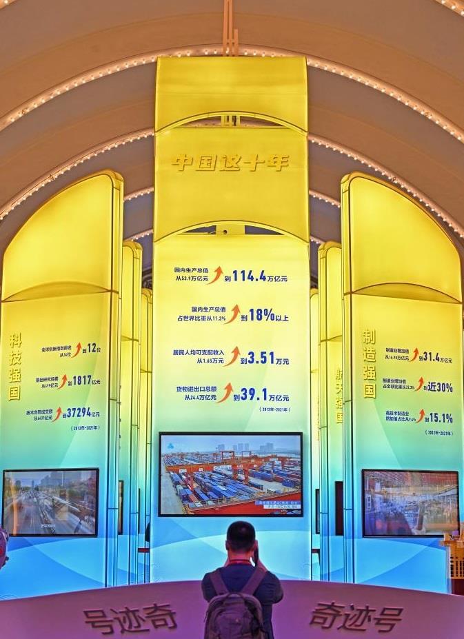 新时代10年,我国经济实力实现历史性跃升,国内生产总值从54万亿元增长到114万亿元,经济总量占世界经济的比重达18.5%,提高7.2个百分点,稳居世界第二位;人均国内生产总值从39800元增加到81000元。