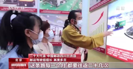 中国邮政集团有限公司四川省甘孜州甘孜县邮政分公司邮运驾驶组组长其美多吉:总书记的报告是一个意义深远、催人奋进的好报告。总书记在报告中提到的要增加民生福祉,对于我来说感悟非常深。现在高原的藏族人民的生活发生了一个翻天覆地的变化,过去我开的邮车是4吨的车,而且从康定到德格的话,每天只有一辆邮车,而且邮车的话装不满,现在每天4辆12吨的邮车,而且都是满载的。过去就是运进来的报刊,党报党刊,还有一些少量的信件,几乎没有运出来的东西,现在运进来的东西多,运出来的东西也多了,是老百姓的产品变为了商品,所以这些都是应该说是在我邮路上看到的。