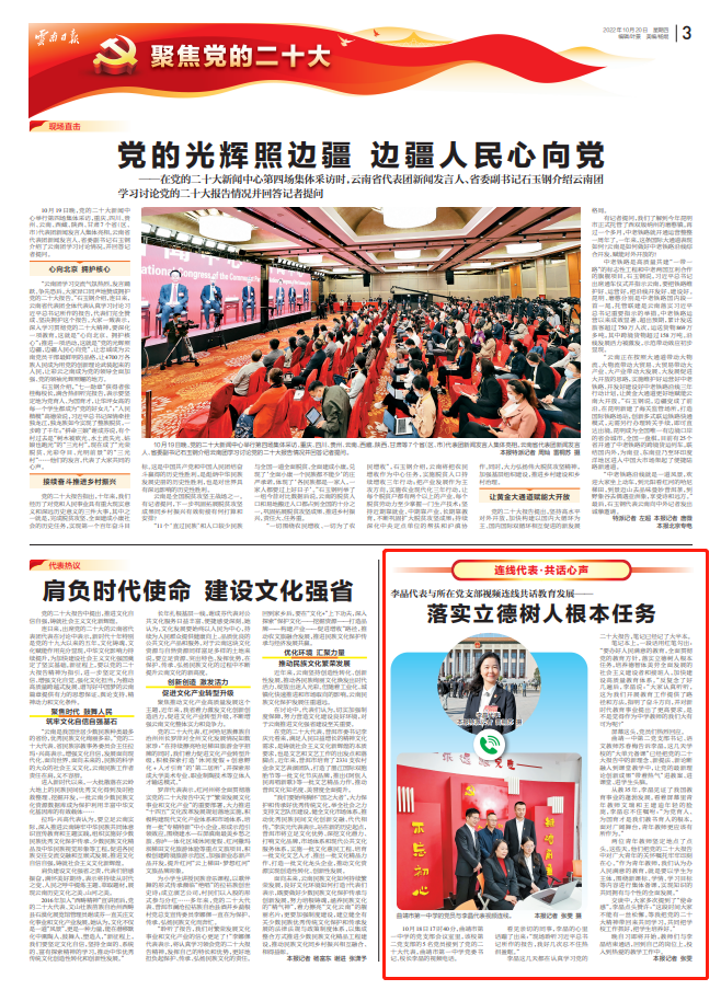 曲靖一中第二党支部书记、语文教师苏春梅告诉李晶,这几天学校的“大单元备课”已经把党的二十大报告中的新理念、新提法、新论断融入到课堂教学中,让党的最新理论创新成果“带着热气”进教案、进课堂、进学生头脑。