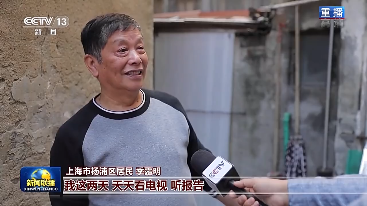 上海市杨浦区居民 季露明:我这两天,天天看电视,听报告,总书记说江山就是人民,人民就是江山,老百姓真的是很满意。国家现在给我们旧居改造,(拿)退休工资,吃吃玩玩,外面锻炼锻炼身体,很好啊。