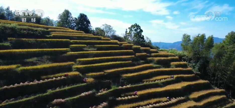 总台记者 孙佳音:我现在是在江西省赣州市崇义县的上堡梯田。大家通过镜头可以看到这里的一大片梯田,稻子已经丰收,在阳光的照射下闪着金黄色,当地的村民也正在这里的田里忙着收割、打捆、搬运稻谷。