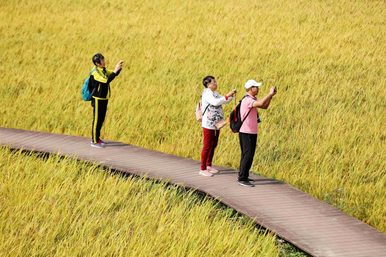 游客在拍摄金色的稻田(央广网发 龚普康 摄)