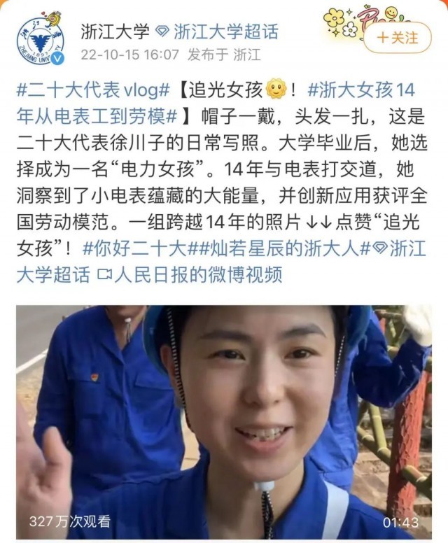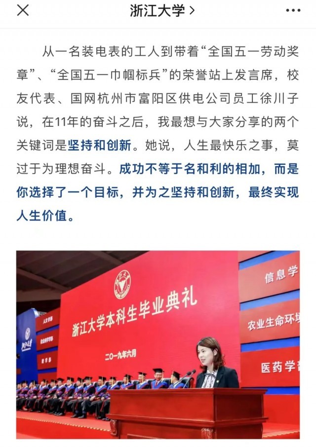 2019年,浙江大学邀请徐川子站上了当年本科生毕业典礼的发言席。