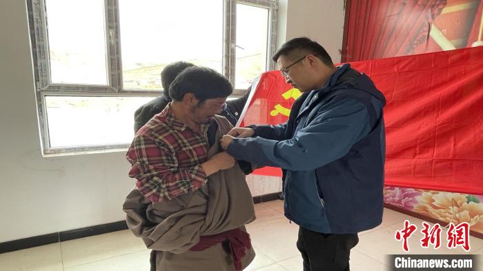 图为甄辉(右)为当地新入党党员佩戴党徽。 甘德县委宣传部 供图