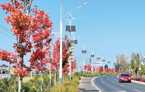 图为环湖路晋宁段绿化带里的枫叶红似火。