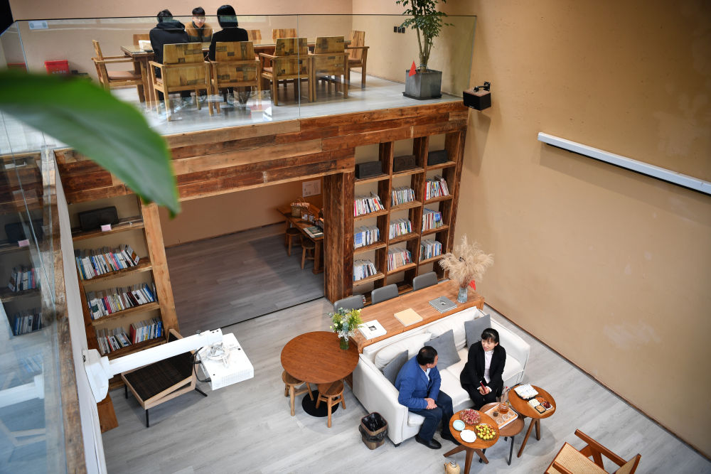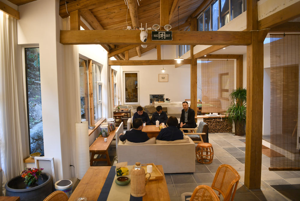 游客在秦岭北麓的西安市长安区抱龙村一家民宿的会客厅内休息(10月13日摄)。新华社记者 邵瑞 摄