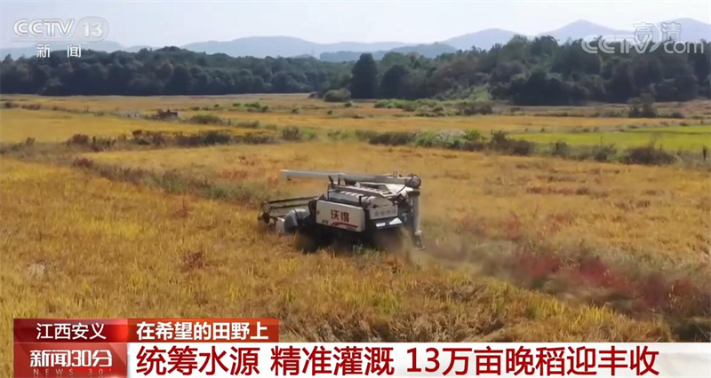 这几天,江西南昌安义县的13万亩晚稻迎来收获。虽然今年经历了旱情,但当地灌区统筹各种水源对稻田进行精准灌溉,水稻仍然获得丰收。